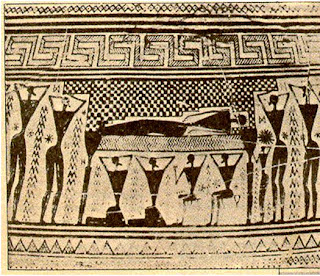 Neste vaso fúnebre ateniense (750 a.C), os mortos e aqueles que choram por ele são representados na cerâmica de estilo geométrico têm características negras.